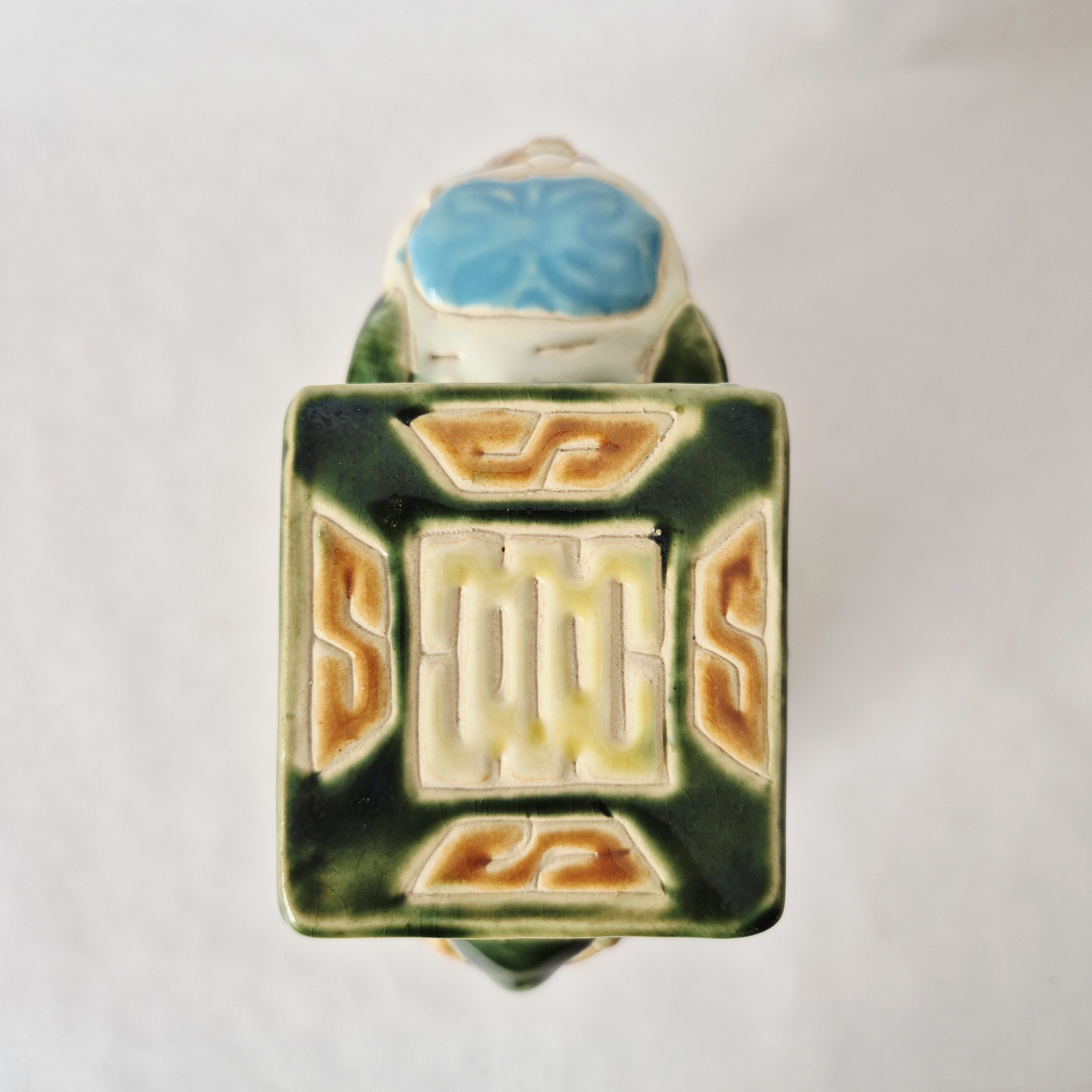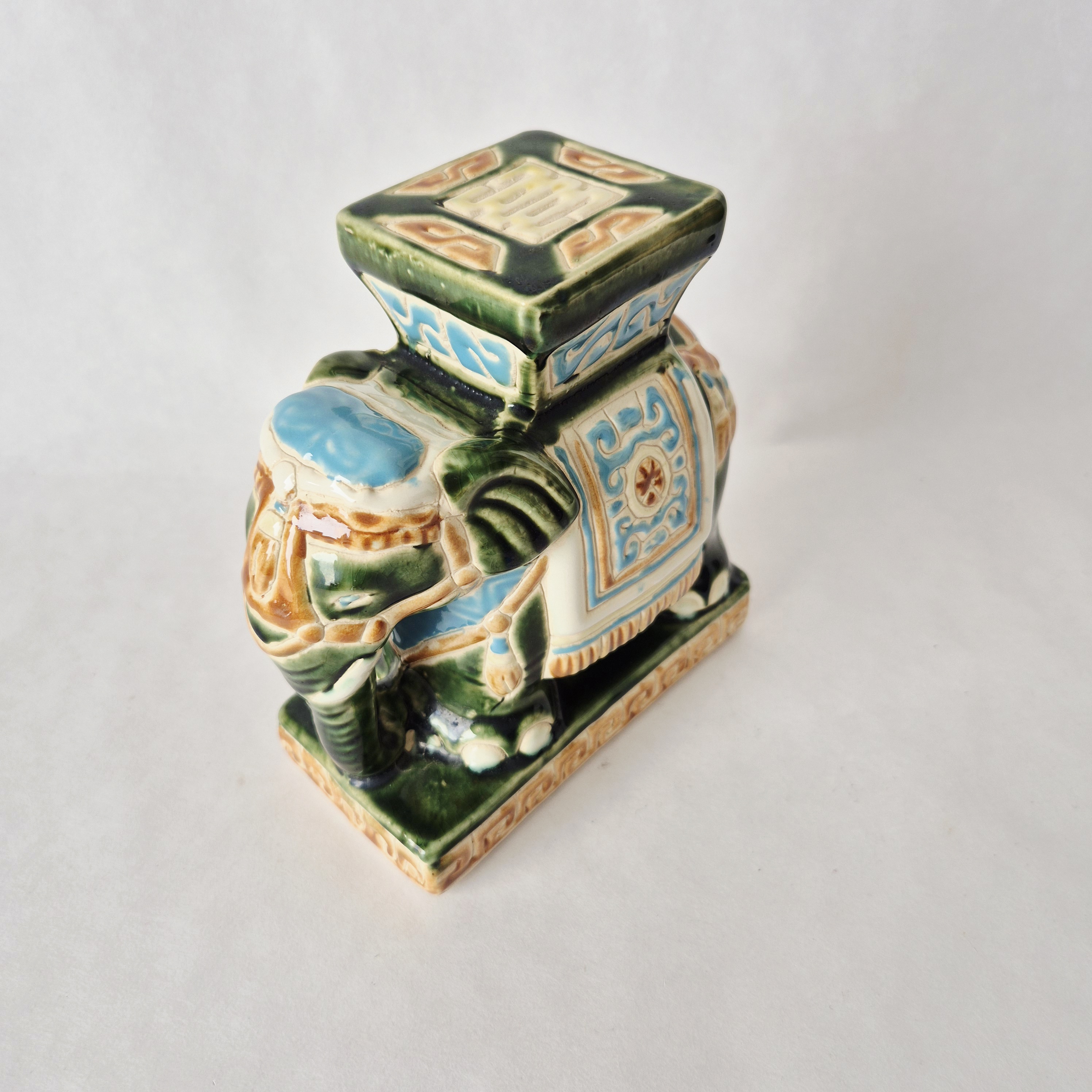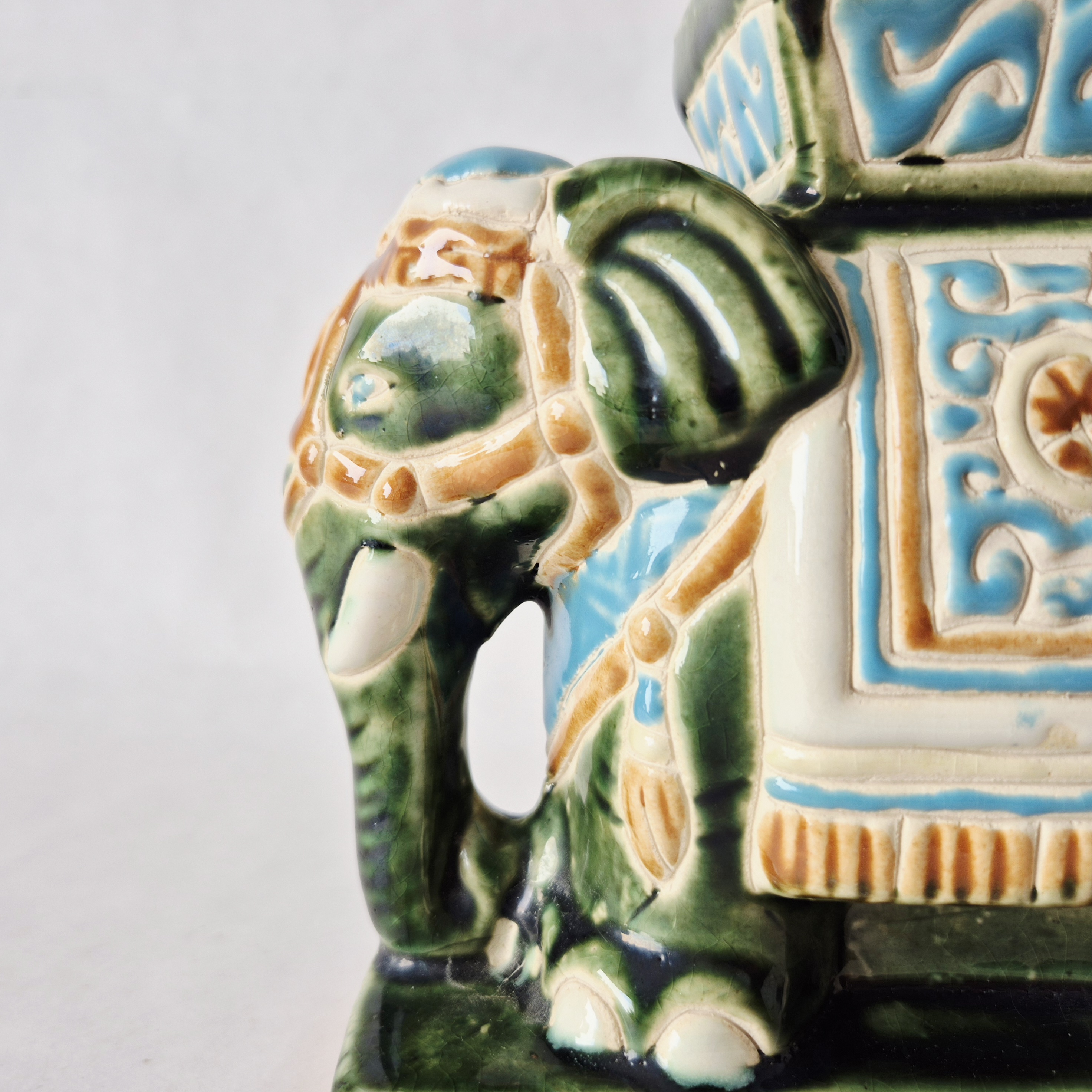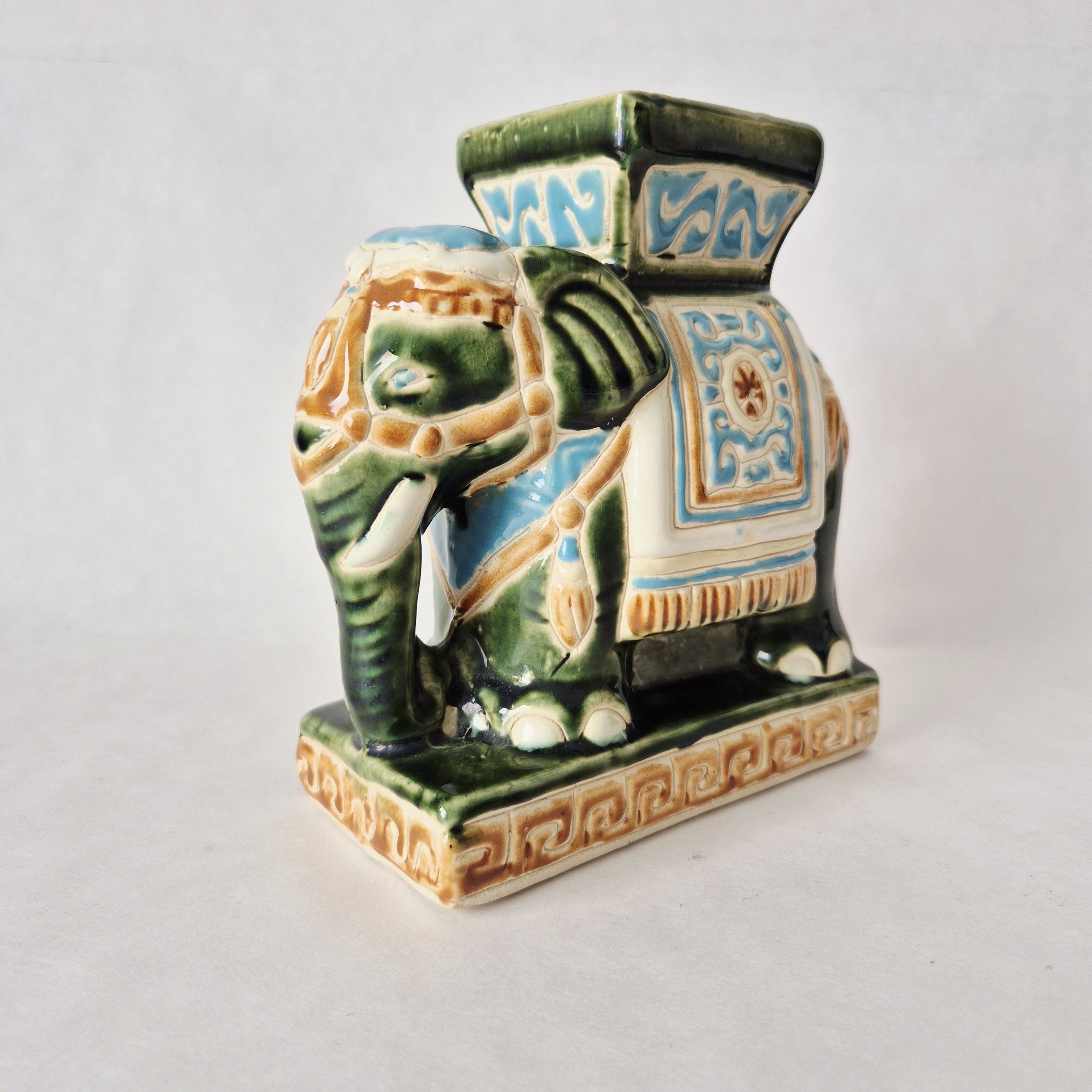 OverzichtKeramische plantenstandaard in de vorm van een olifant. Prachtige kleuren en perfect voor in een vintage, boho, eclectisch of Aziatisch geinspireerd interieur