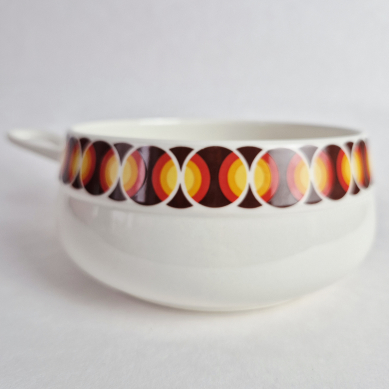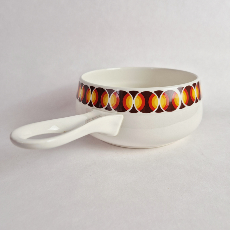 OverzichtPrachtige vintage Villeroy & Boch fonduepan met iconisch jaren 70-patroon in warme rood-, oranje- en geeltinten. Deze keramische pan heeft een stijlvolle retroprint rondom de rand en een elegante, geïntegreerde handgreep. Een echt statement piece voor op tafel of als decoratief item in een vintage keuken.