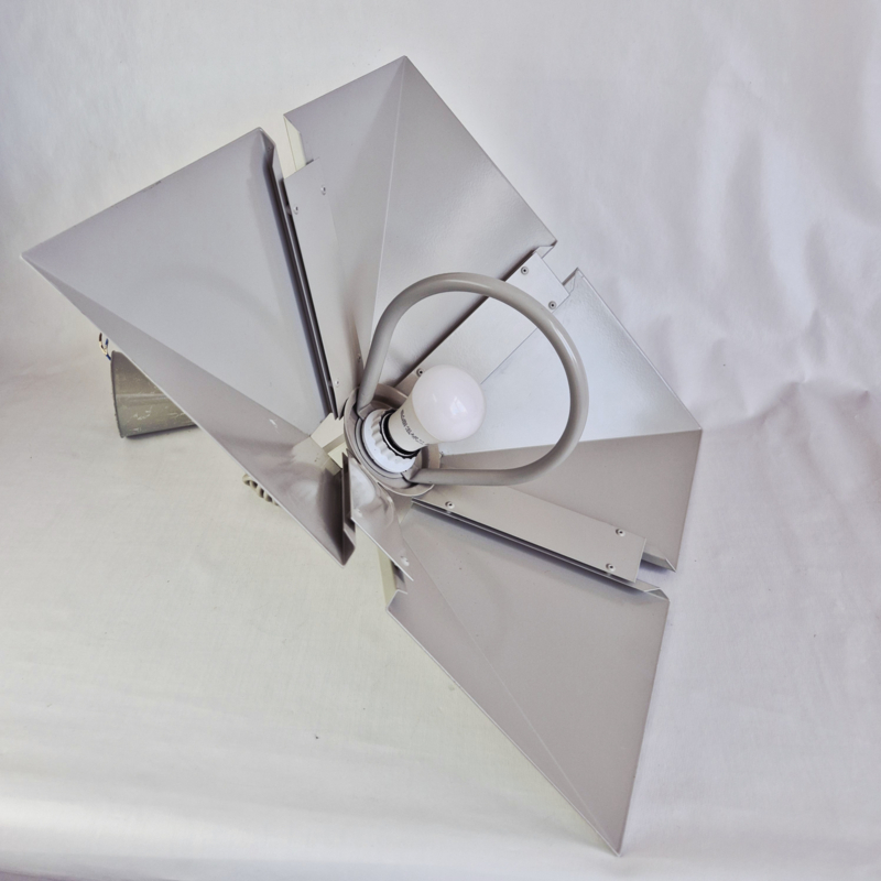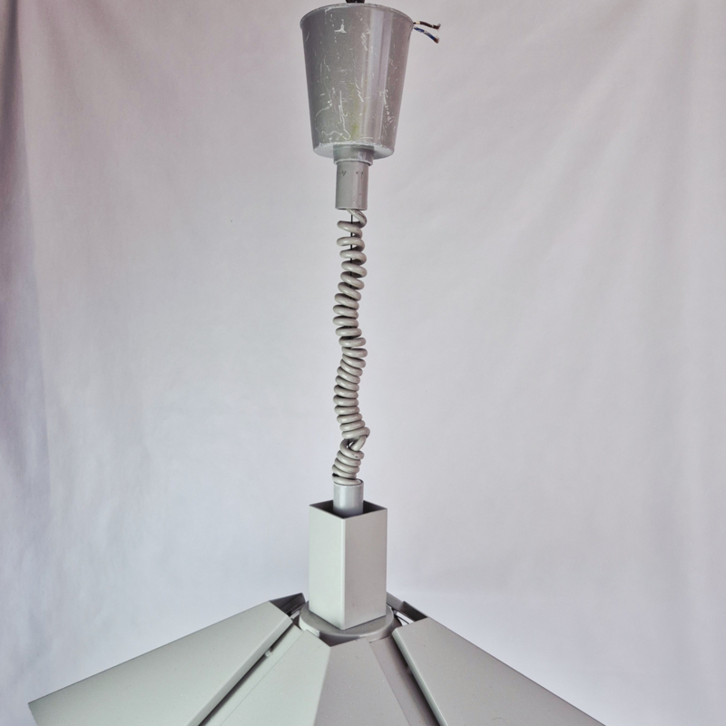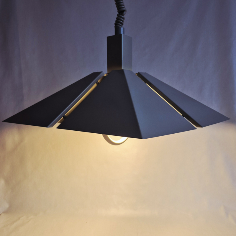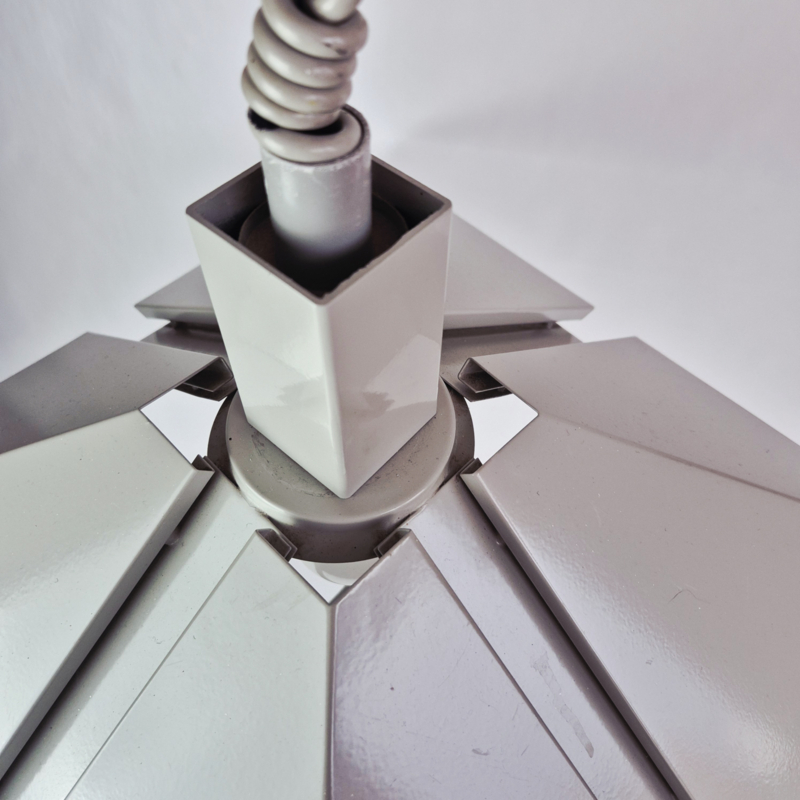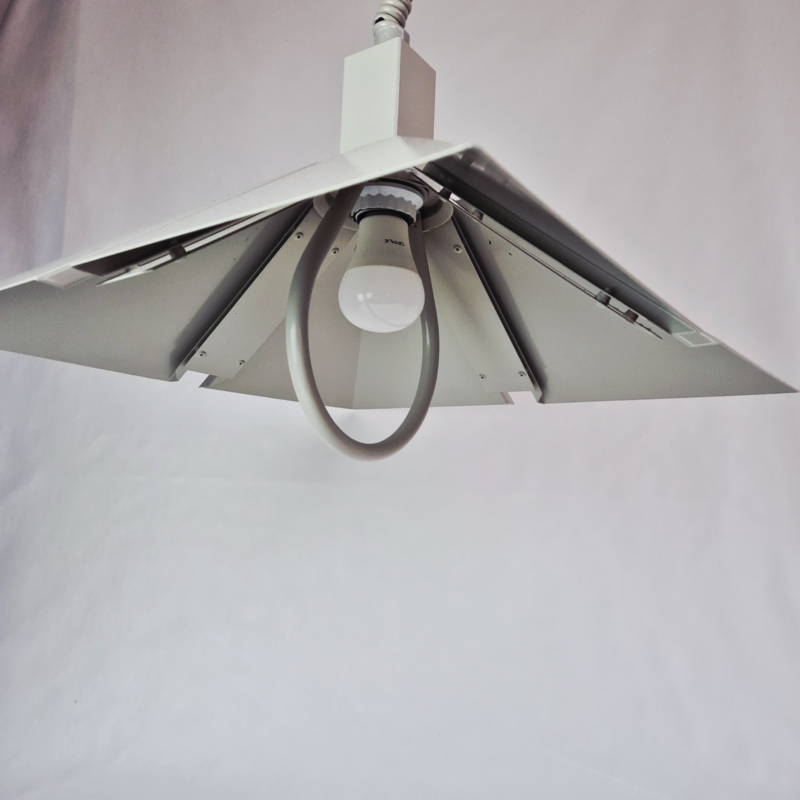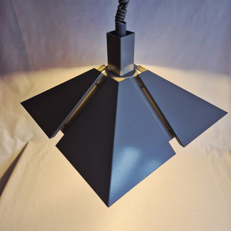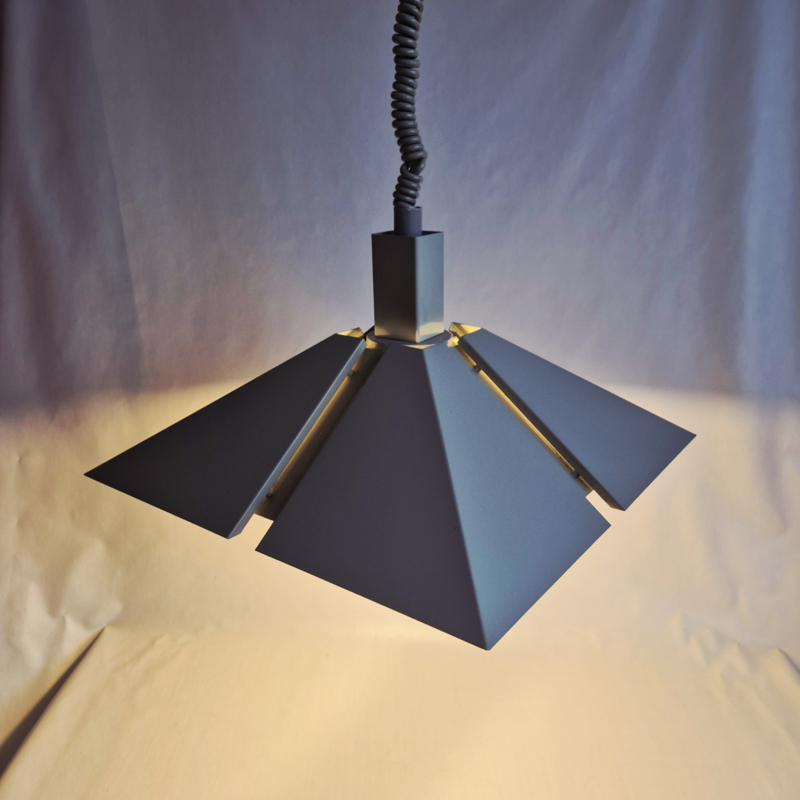 OverzichtHanglamp uit de jaren 80, uitgevoerd in een strak geometrisch ontwerp met meerdere metalen panelen in zachte grijstint en toegschreven aan Dijkstra Design. Deze lamp is in hoogte verstelbaar, waardoor hij perfect is boven een eettafel, bureau of in een vide.