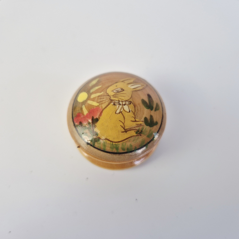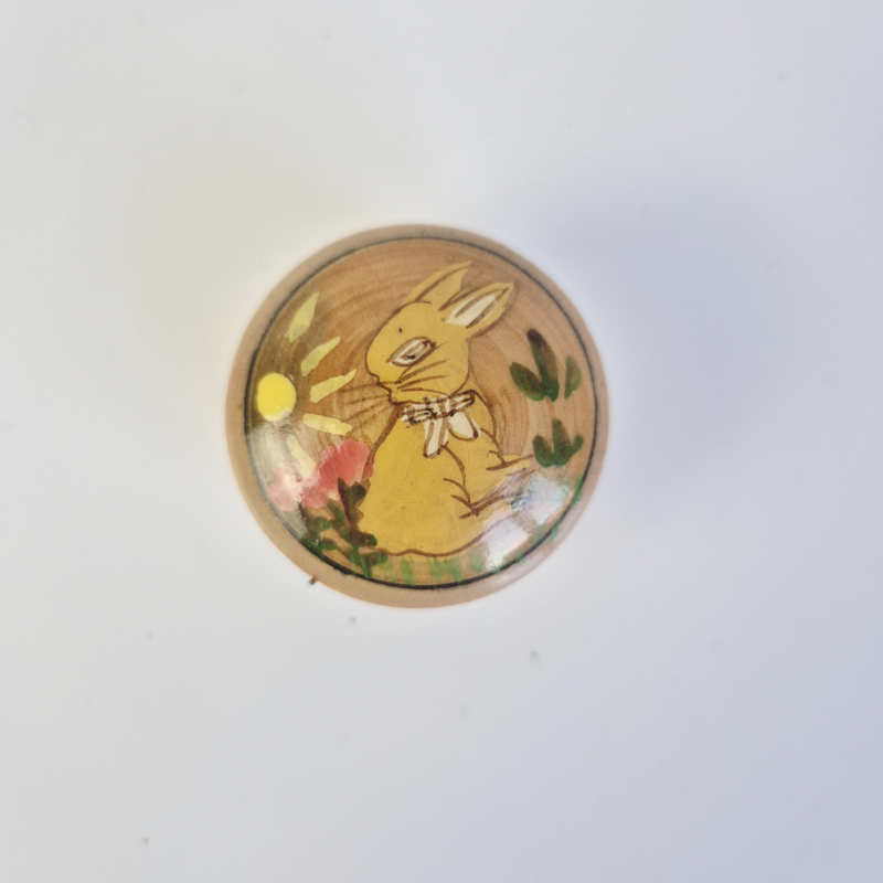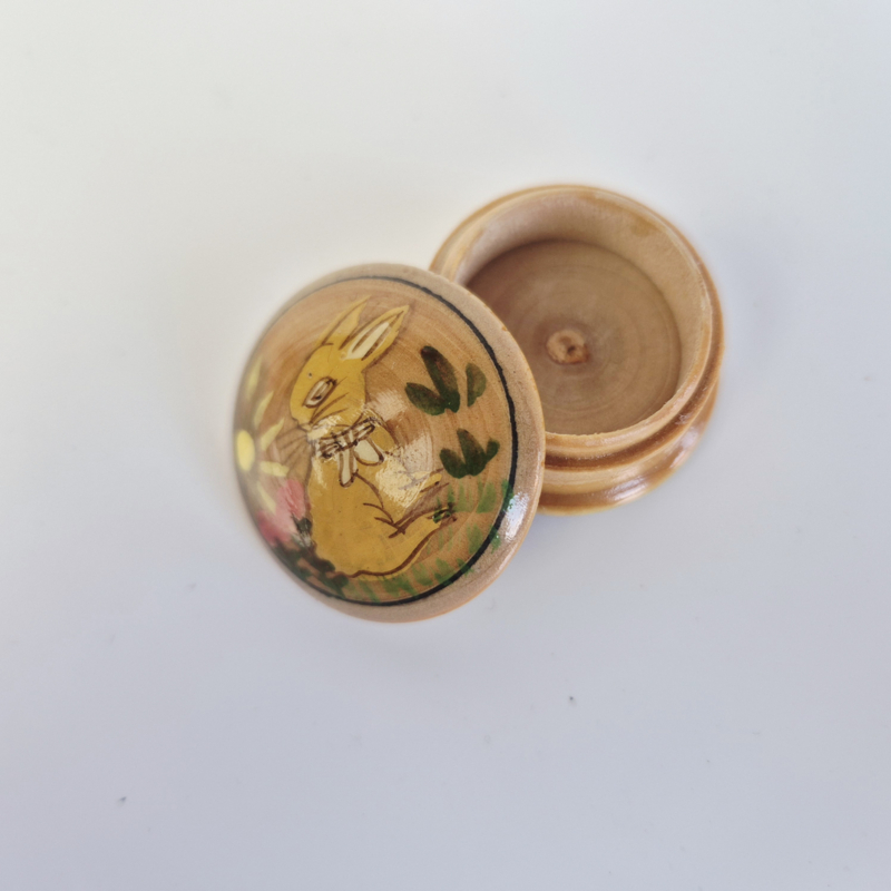 OverzichtHouten, gedraaid pillendoosje, met de hand beschilderd. Heel leuk voorjaars/paas decor met een haas, zon en plantmotieven. Het doosje combineert praktische bruikbaarheid met een tijdloze esthetiek, en straalt de charme uit van een vervlogen tijdperk.