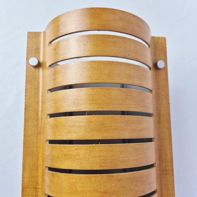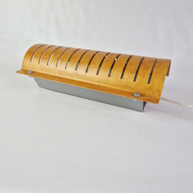 OverzichtOriginele IKEA Strimma wandlamp, een iconisch voorbeeld van Scandinavisch design uit de jaren 80. Deze vintage wandlamp heeft een karakteristieke gebogen houten kap, die zorgt voor een warm en sfeervol lichtspel op de muur.