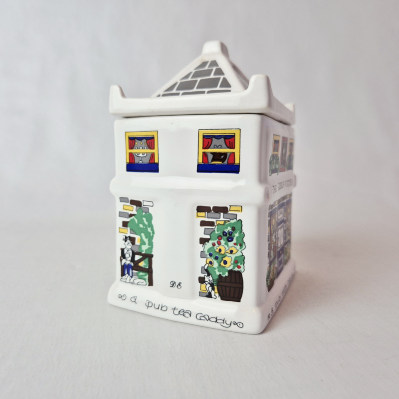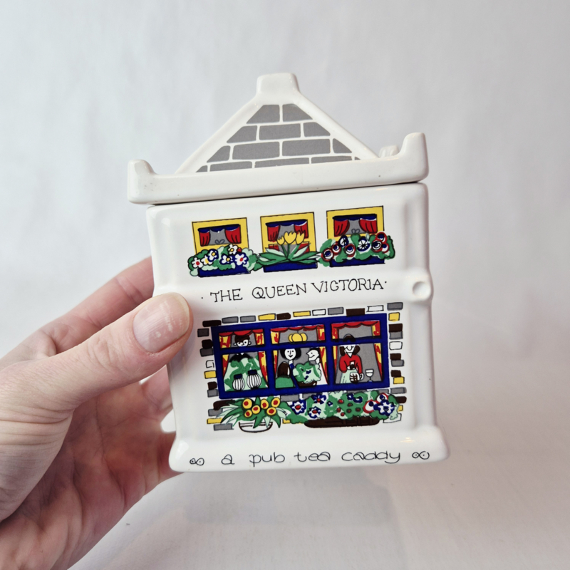 OverzichtWade England English Life 'The Queen Victoria' pub theepot. Ontworpen door Barry Smith en Barbara Wootton. Deze prachtige tea caddy is gemaakt van hoogwaardig porselein en keramiek met glanzende afwerking.