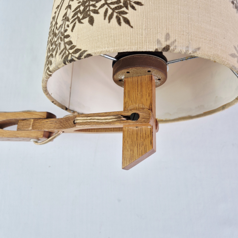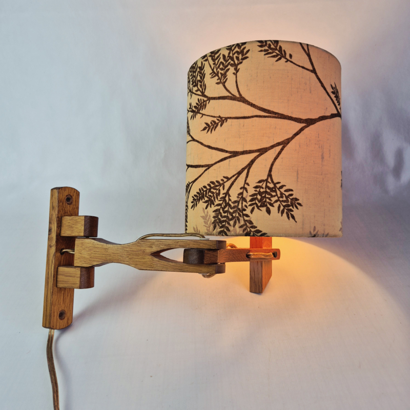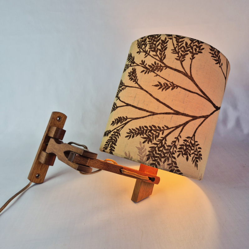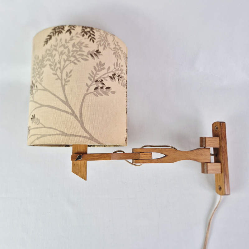 OverzichtHouten wandlamp met schaarfunctie. De lamp kan gemakkelijk in elke willekeurige positie worden geplaats.