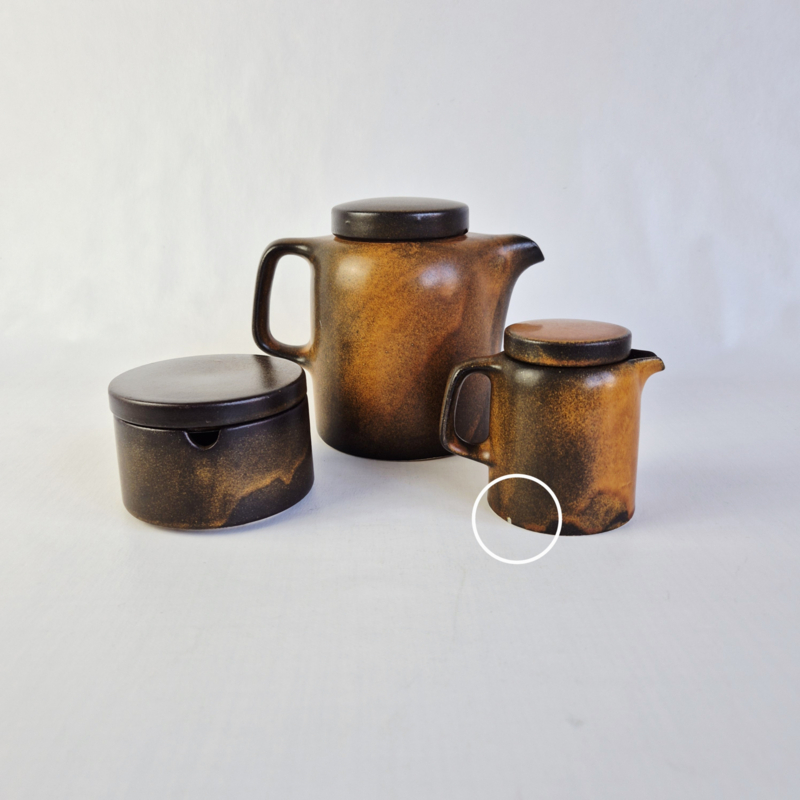 OverzichtLeuke set uit de jaren ’60 in heel mooi gevlamde kleuren in mat bruin/oranje. Het servies voelt glad aan en het servies heeft geen handvat op de deksels wat de set heel strak en tijdloos maakt. Een echte eye catcher!
