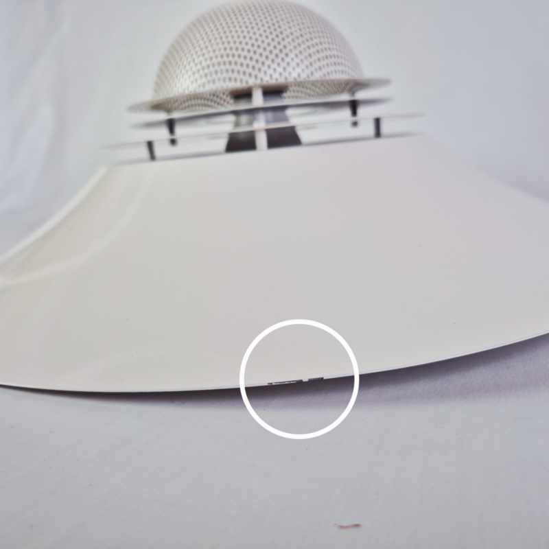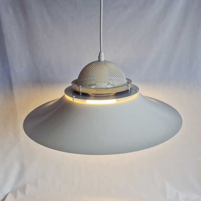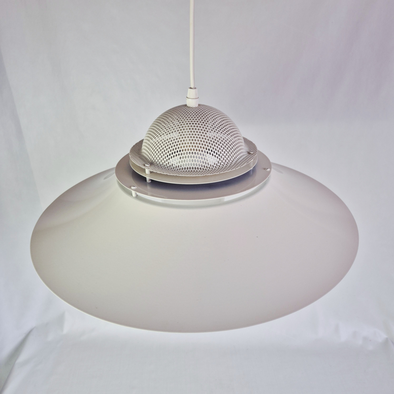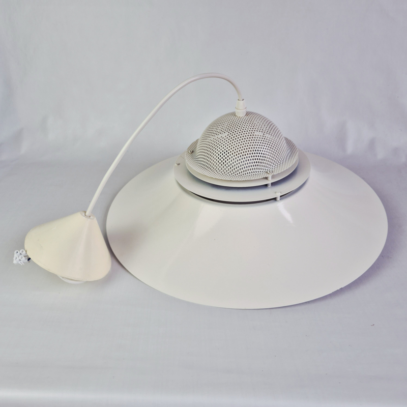 OverzichtStijlvolle vintage hanglamp van wit metaal met geperforeerde metalen kap. Geeft een sfeervol licht en past perfect in een mid century, Scandinavisch of retro interieur. Toegeschreven aan ARO Leuchte Duitsland.