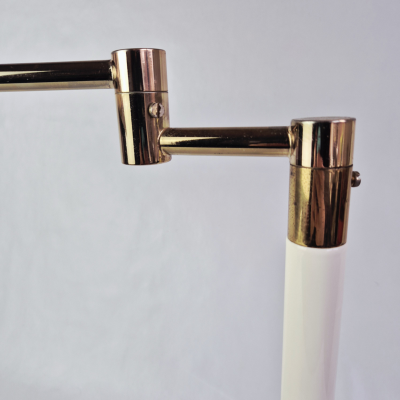 OverzichtStijlvolle vintage tafellamp in wit met goudkleurige details, geïnspireerd op mid century modern design. De verstelbare arm maakt deze lamp perfect als bureaulamp, leeslamp of sfeervolle verlichting in je interieur. Een elegante eyecatcher voor een retro, modern of minimalistisch interieur.