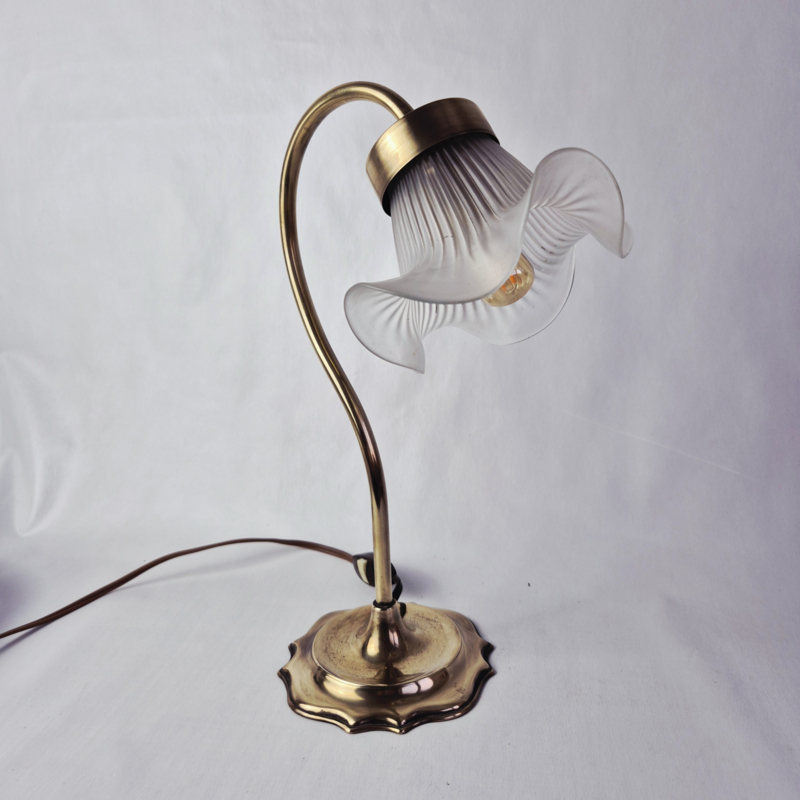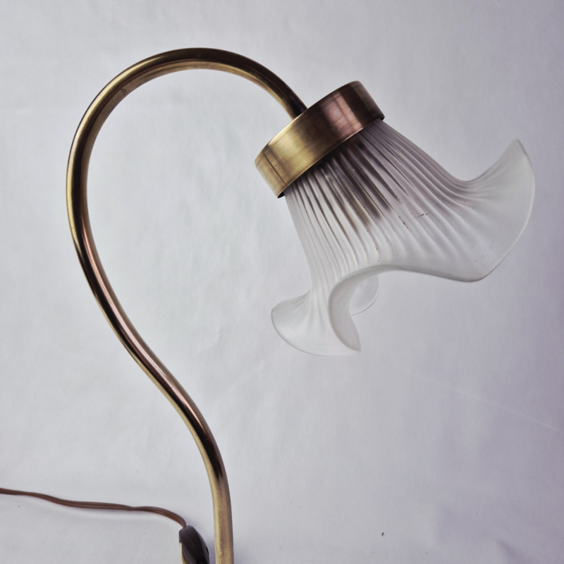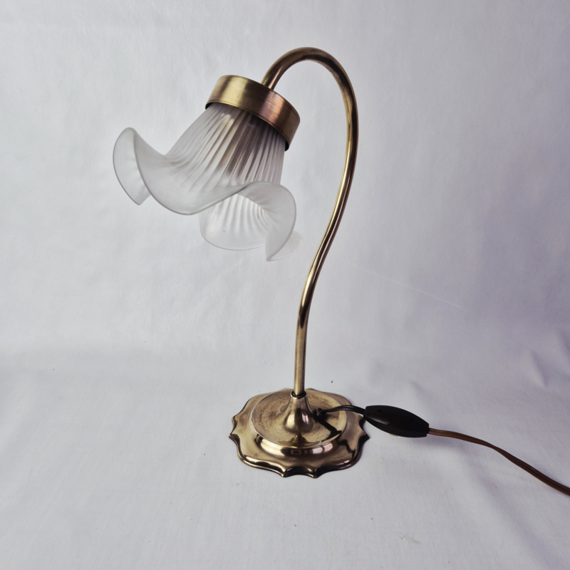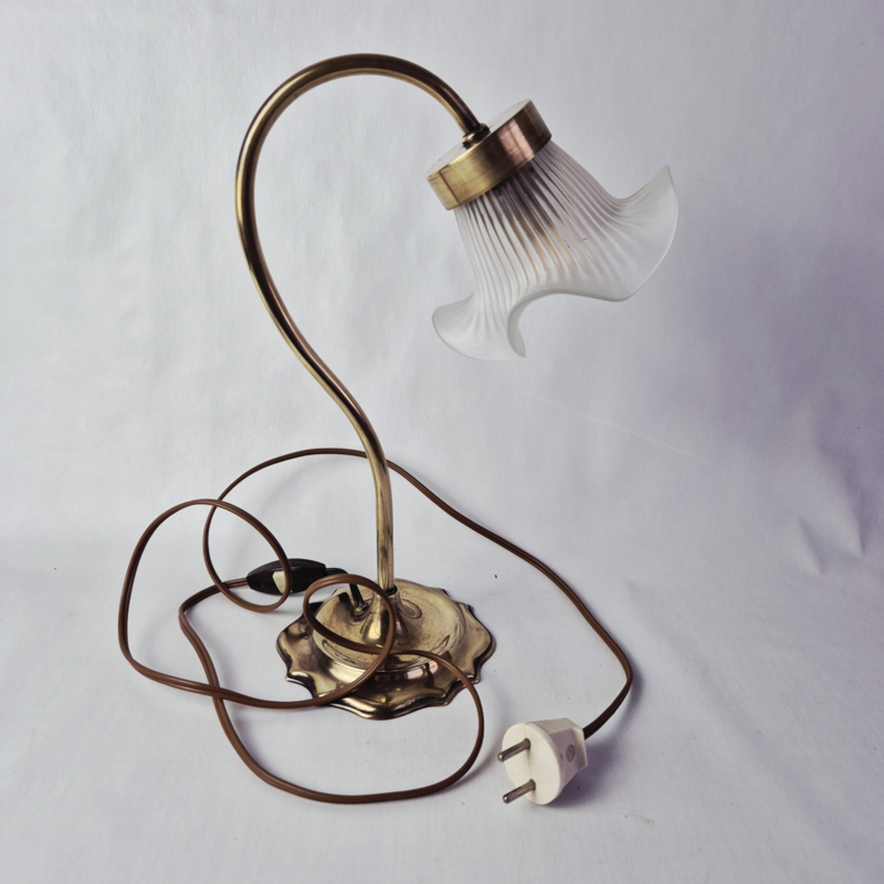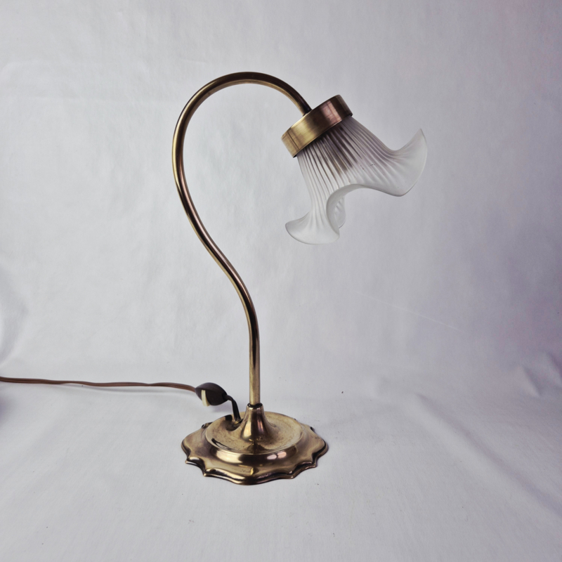 OverzichtPrachtige, vintage tafellamp in Art Nouveau stijl met een kap van satijnglas. De lamp geeft prachtig, sfeervol licht.