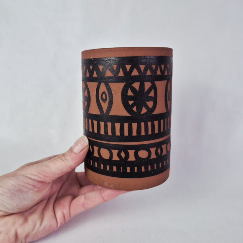 OverzichtOrigineel jaren 60 vaas van Wattisfield Ware Suffolk. De terracotta aardewerken wijde vaas is met de hand geschilderd in een modern patroon uit het midden van de eeuw en gemaakt in Engeland.