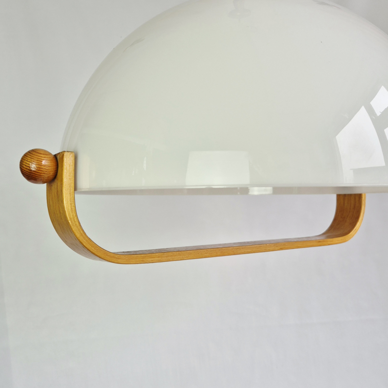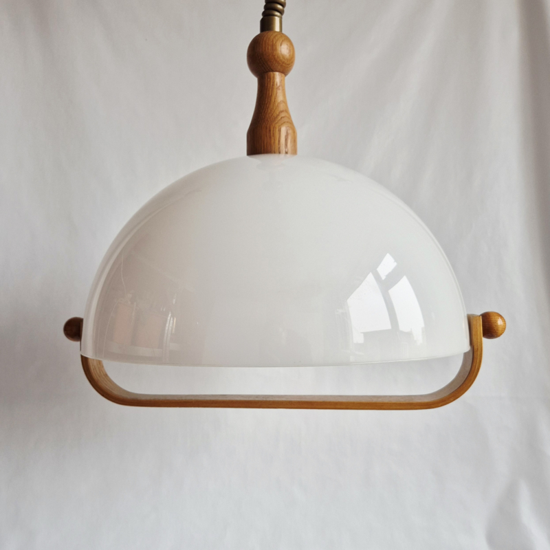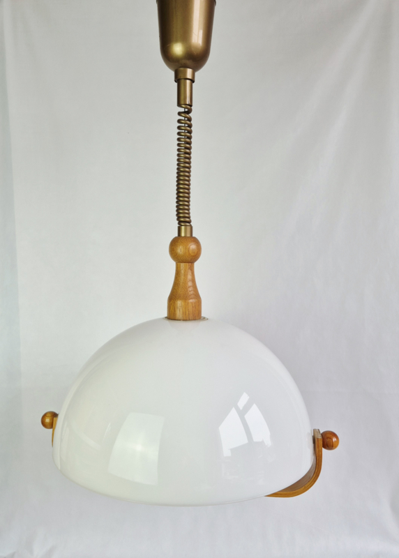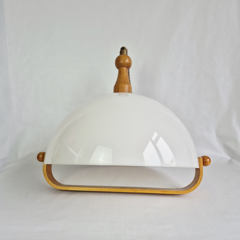 OverzichtStijlvolle vintage hanglamp uit de jaren 60 met een elegante witte kunststof kap en warme houten accenten. Deze mid-century modern lamp geeft een zacht, diffuus licht en is perfect boven de eettafel, in de hal of als eyecatcher in je interieur. Tijdloos design met een Scandinavische uitstraling.