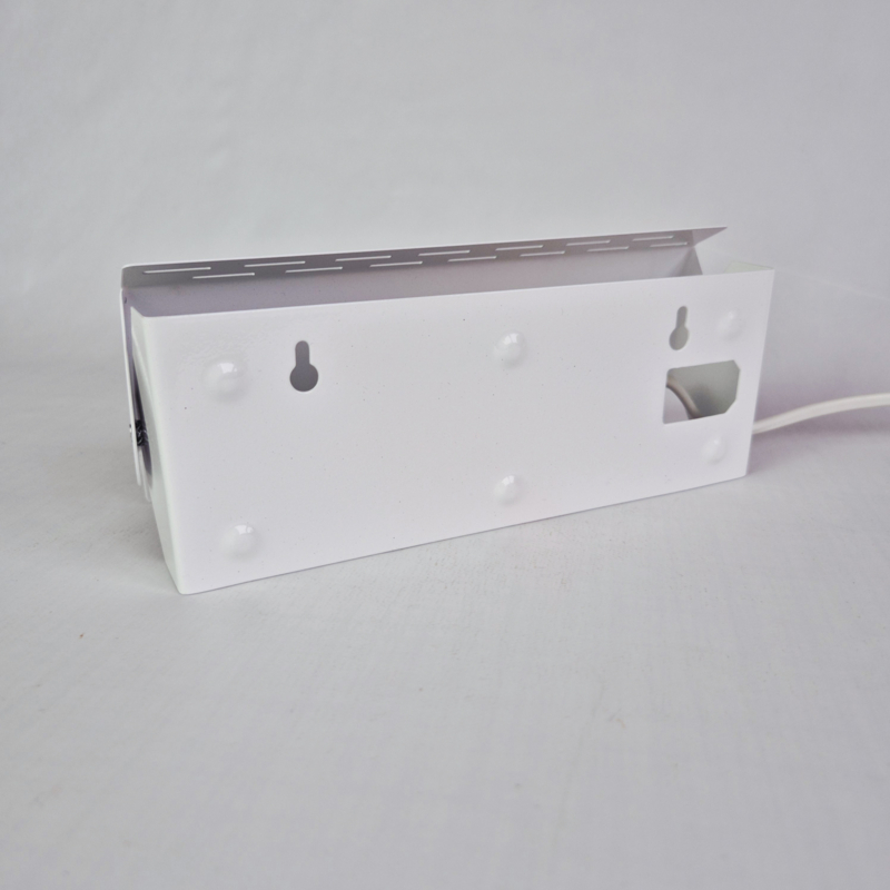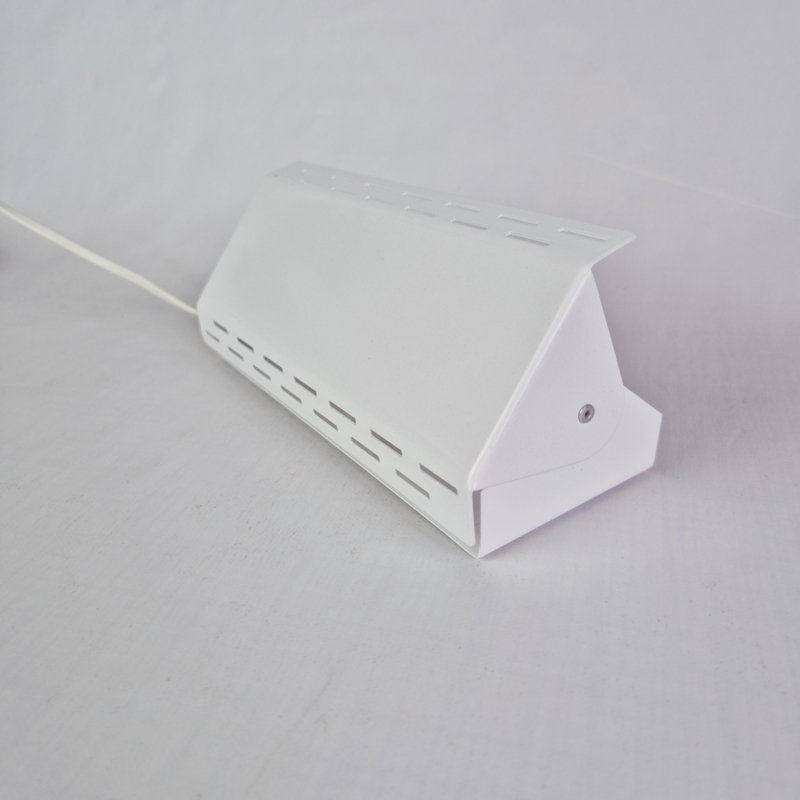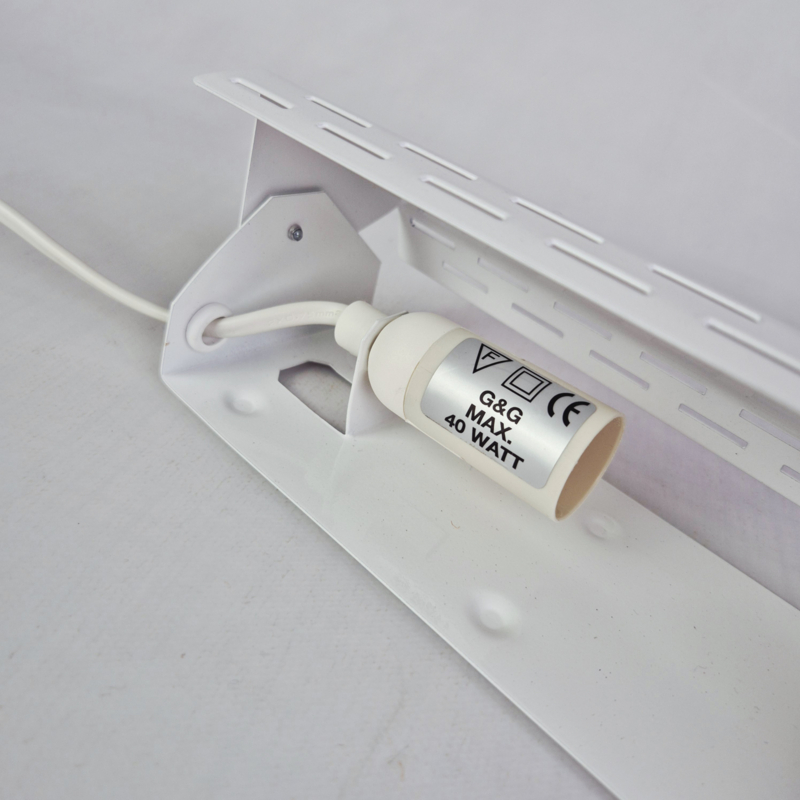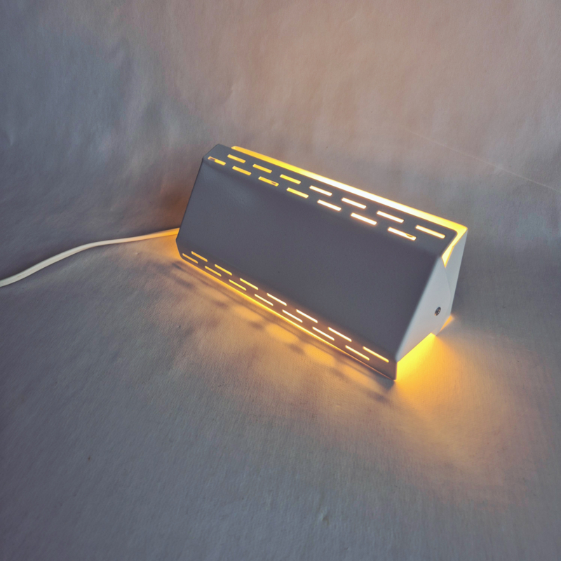 OverzichtStijlvol Mid-Century Modern lampje met een wit metalen kap en witte voet. Het ontwerp heeft mooie sleuven waar het licht prachtig doorheen valt en een strak, geometrisch silhouet. Perfect voor bureau, nachtkastje of wandplank. De kap kan kantelen, zodat je het licht precies kunt richten waar je het nodig hebt.