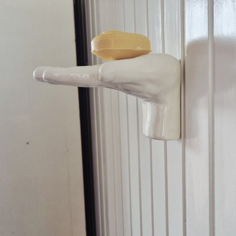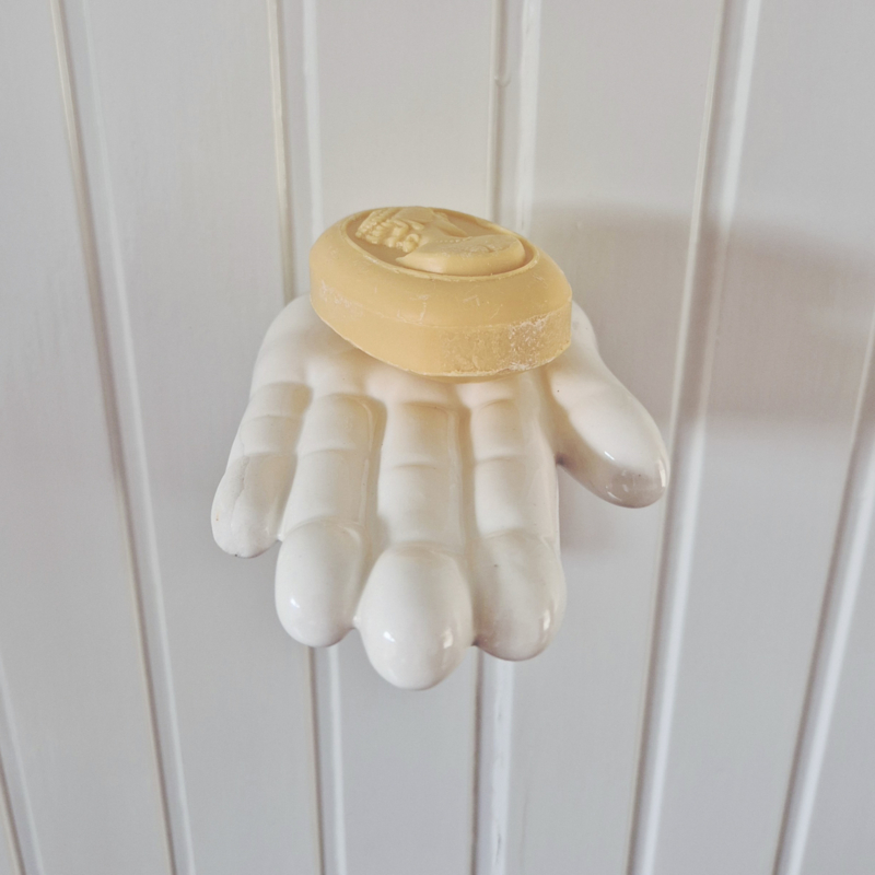 OverzichtHeel leuke boekensteun, jaren 80, in de vorm van een hand. De hand is oorspronkelijk bedoeld als boekensteun, maar is ook geweldig als zeephouder, of bijvoorbeeld met een hangplant erop. Verwijder de stop aan de onderkant en hang de hand op aan een haakje.