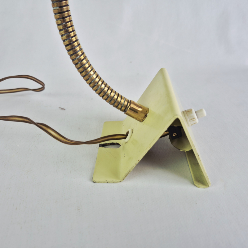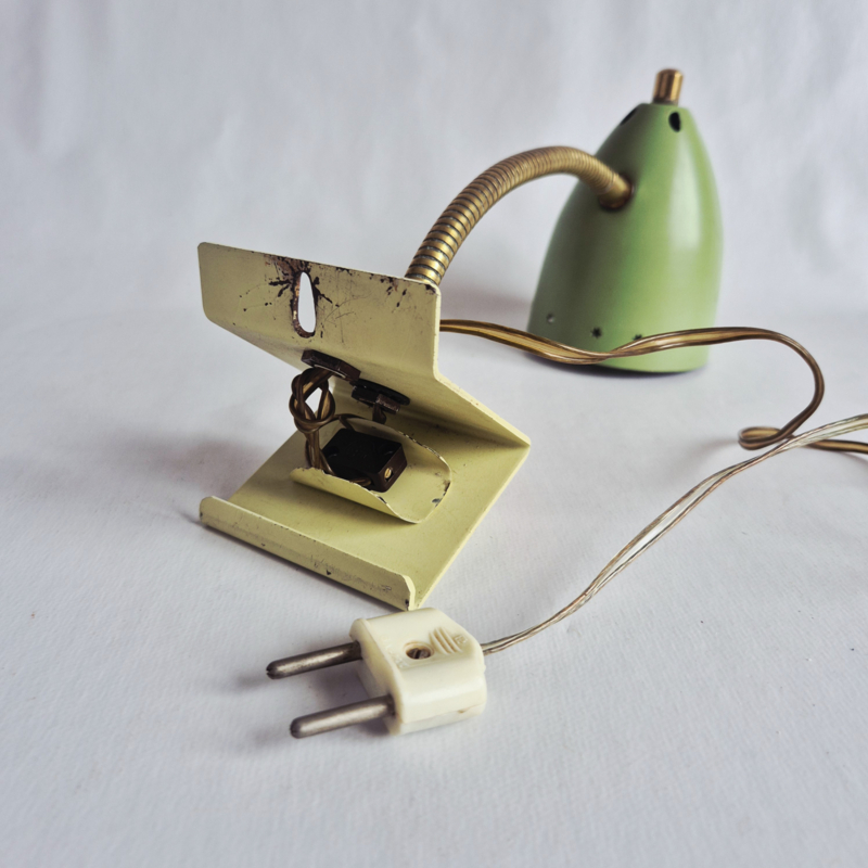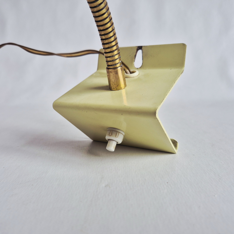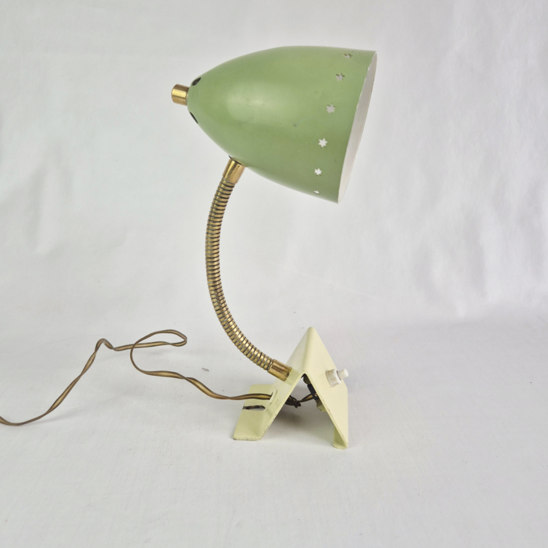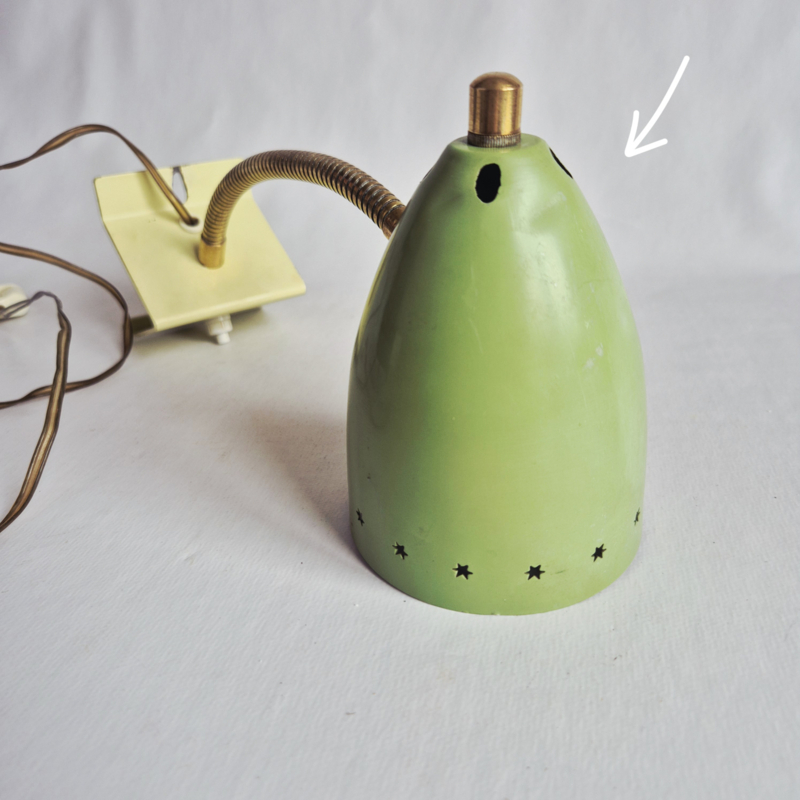 OverzichtDesign wandlamp van Hala, Zeist, Holland, model 13, ontworpen door H.Th.J.A. Busquet in de jaren 50. Groene metalen, verstelbare kap met sterpatroon, messing zwanenhals en crèmekleurige driehoekige voet.
