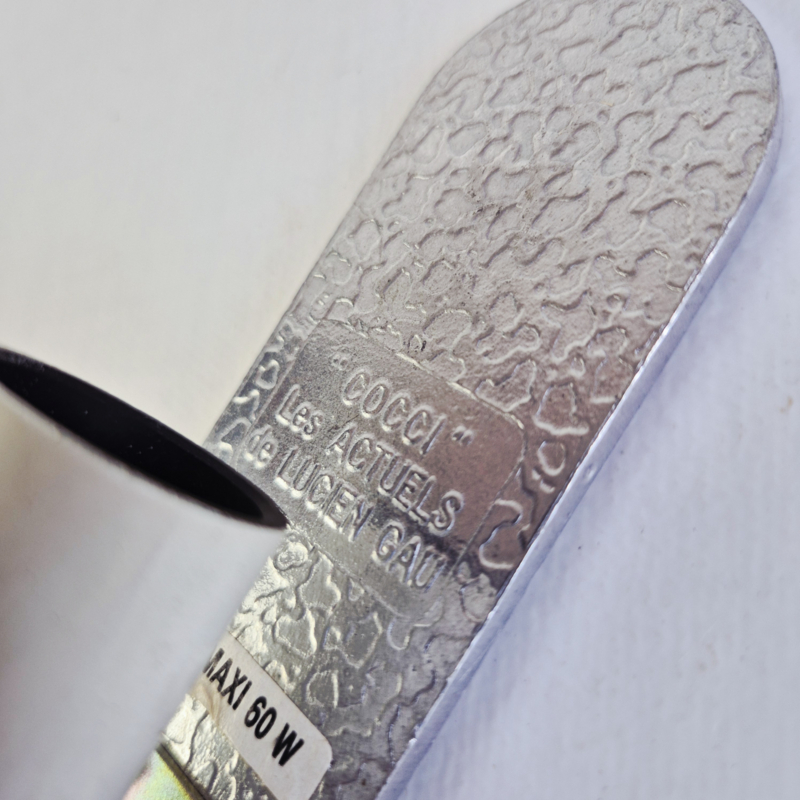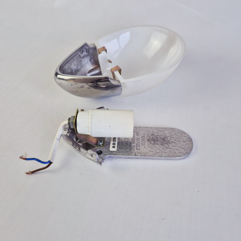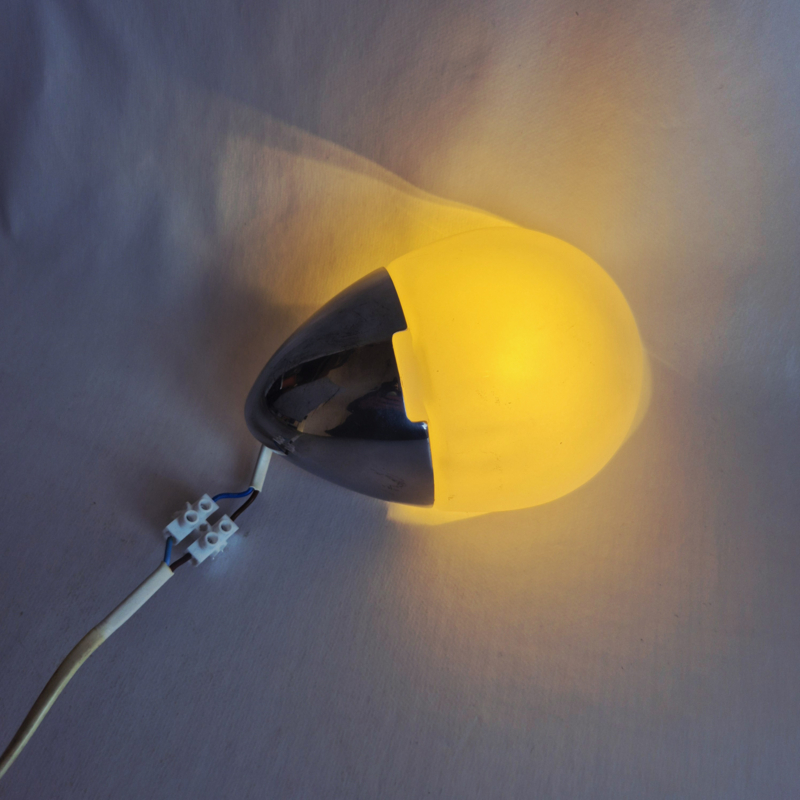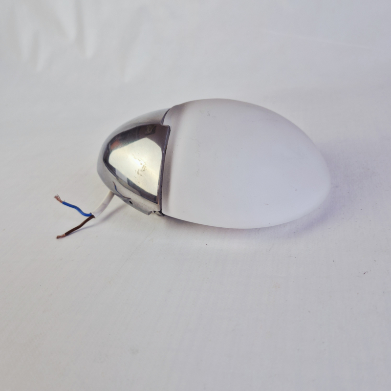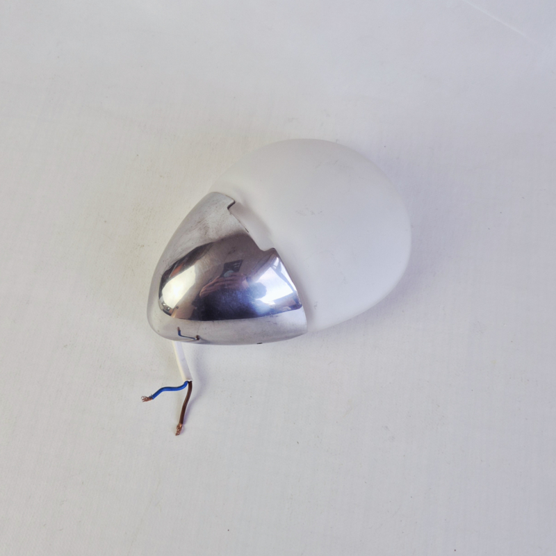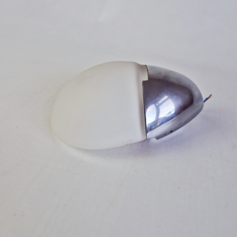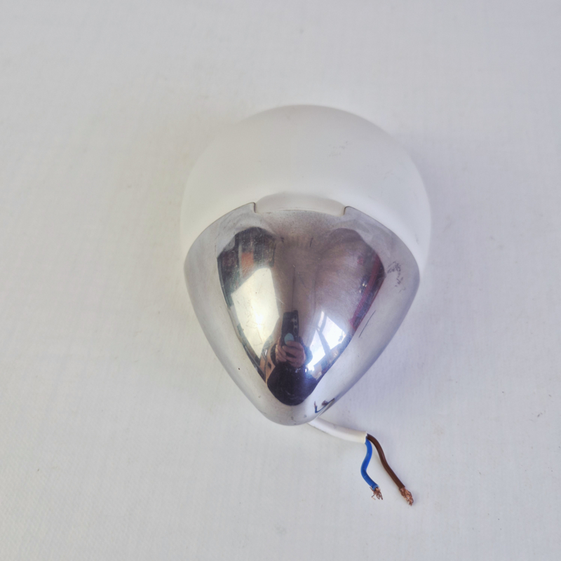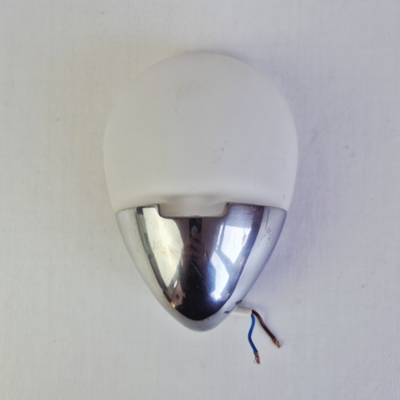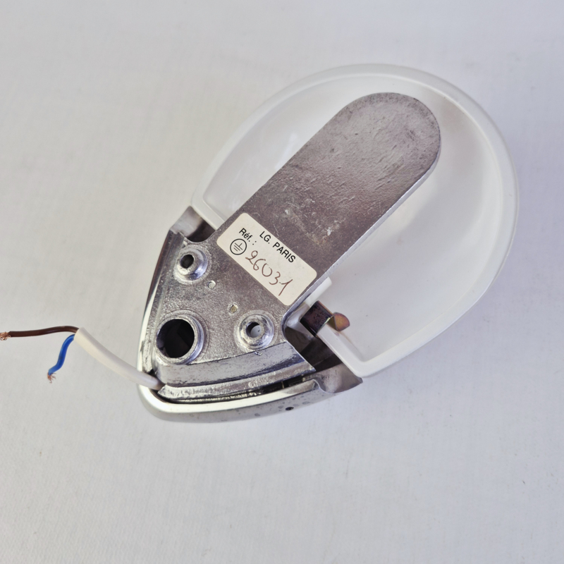 OverzichtOriginele vintage wandlamp van LG Paris in een strak space age ontwerp. Deze lamp combineert een matte wit glazen kap met een glanzende chromen basis, typisch voor Frans design uit de jaren 70.