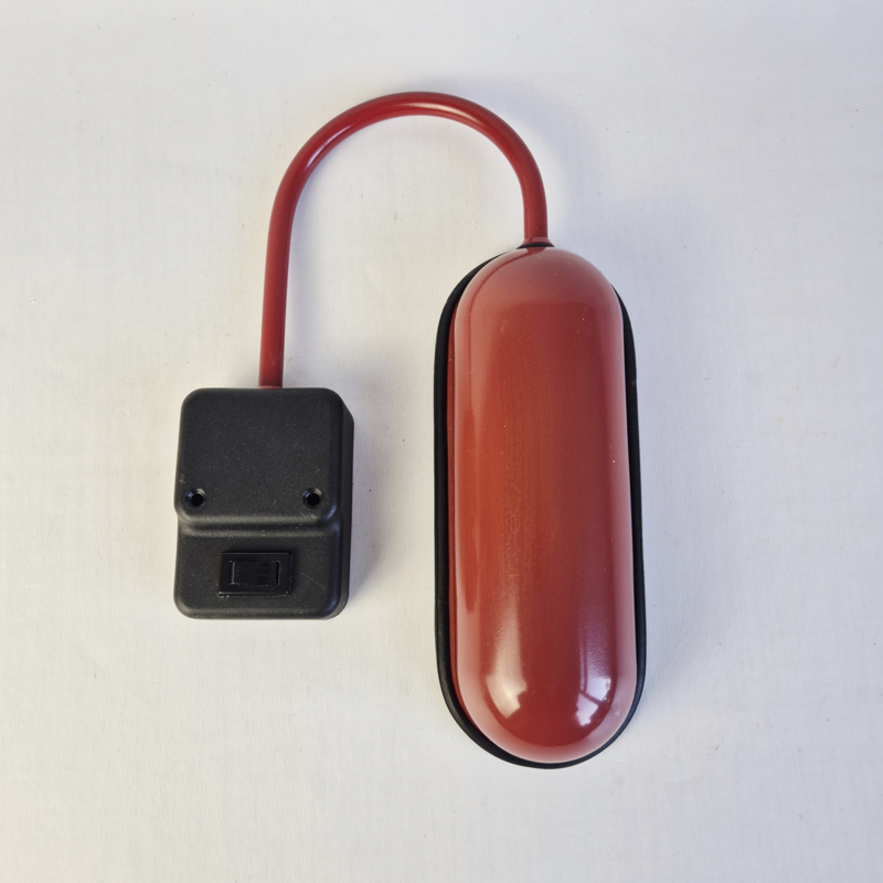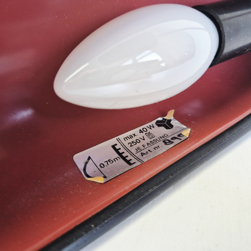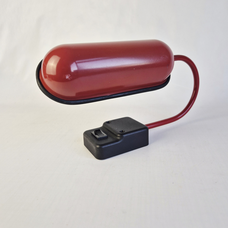 OverzichtPostmoderne vintage wandlamp in opvallend rood design. Deze retro lamp heeft een strak, minimalistisch ontwerp met een gebogen arm en een ovale kap. Perfect als accentverlichting in een modern, industrieel of mid-century interieur.