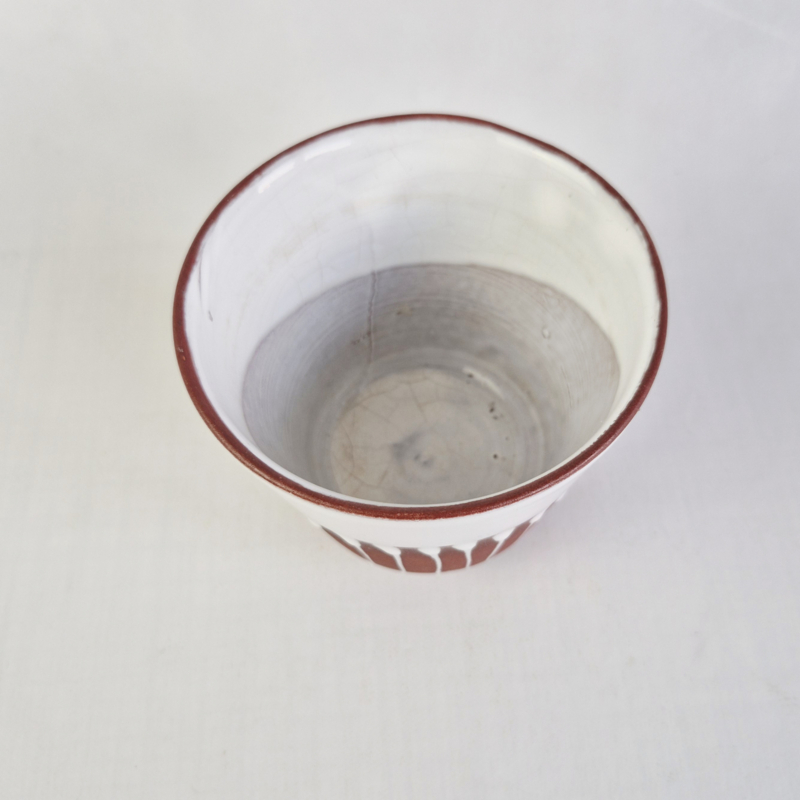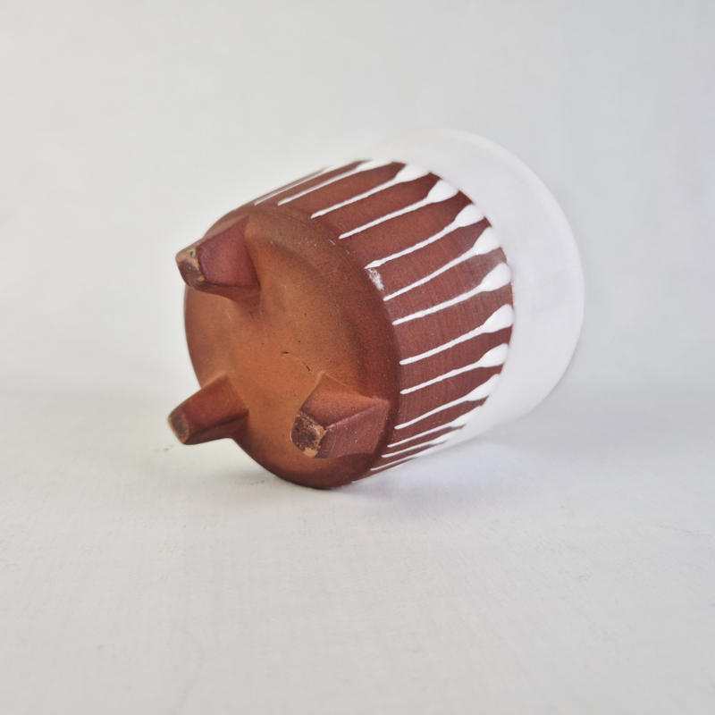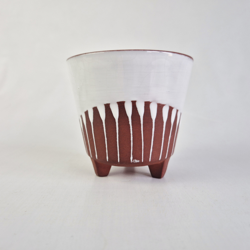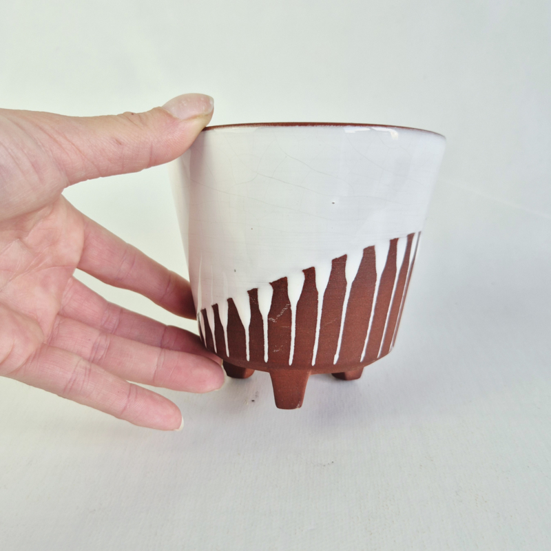 OverzichtOntzettend leuke bloempot van rode klei met witte glazuur en op 3 pootjes.