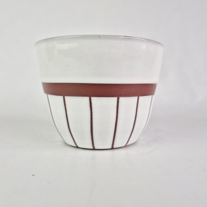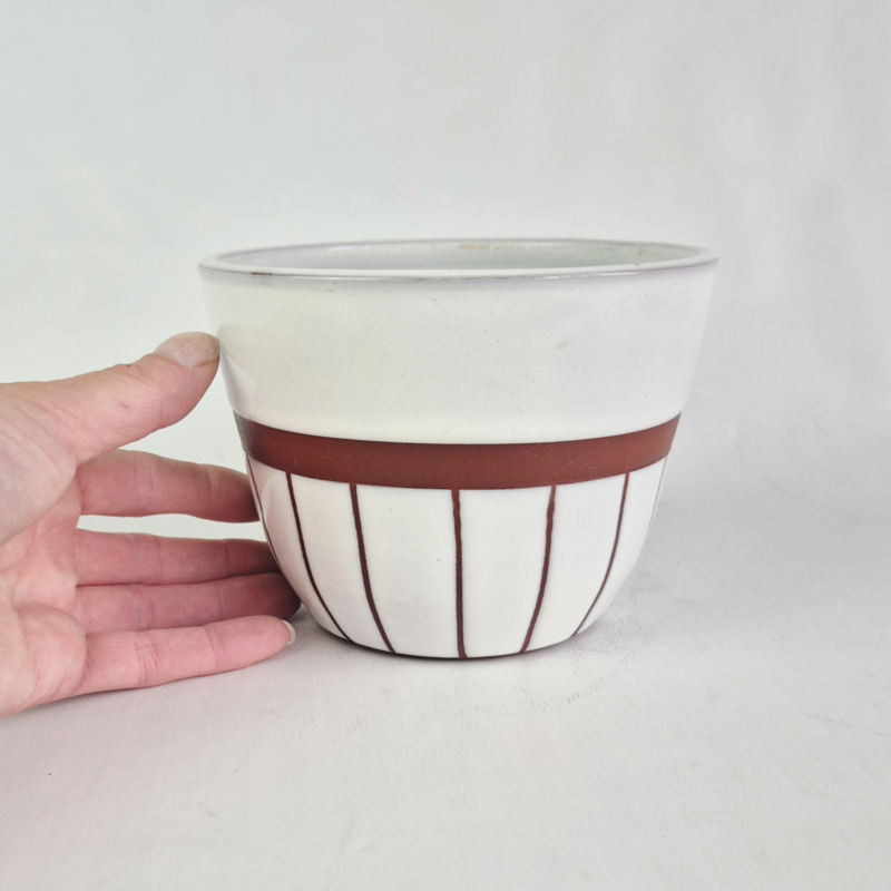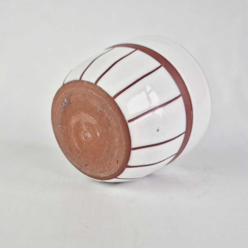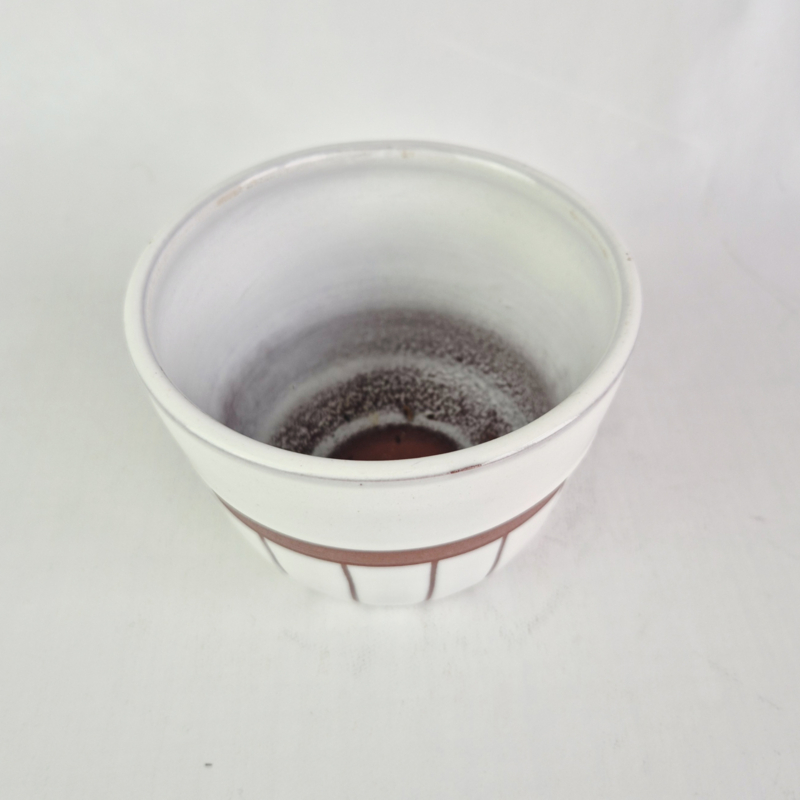 OverzichtOntzettend leuke bloempot van rode klei met witte glazuur uit de jaren 60. Deze bloempotten zijn zeldzaam en staan geweldig in een vintage of boho geïnspireerd interieur.