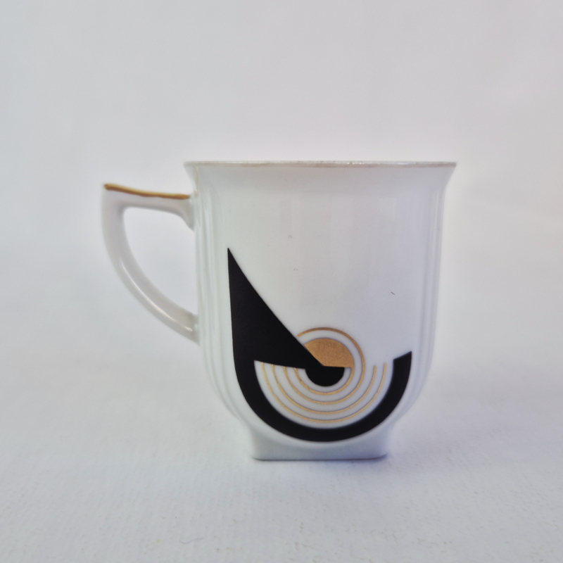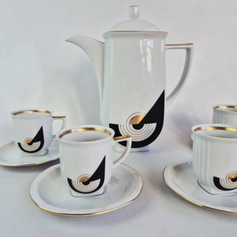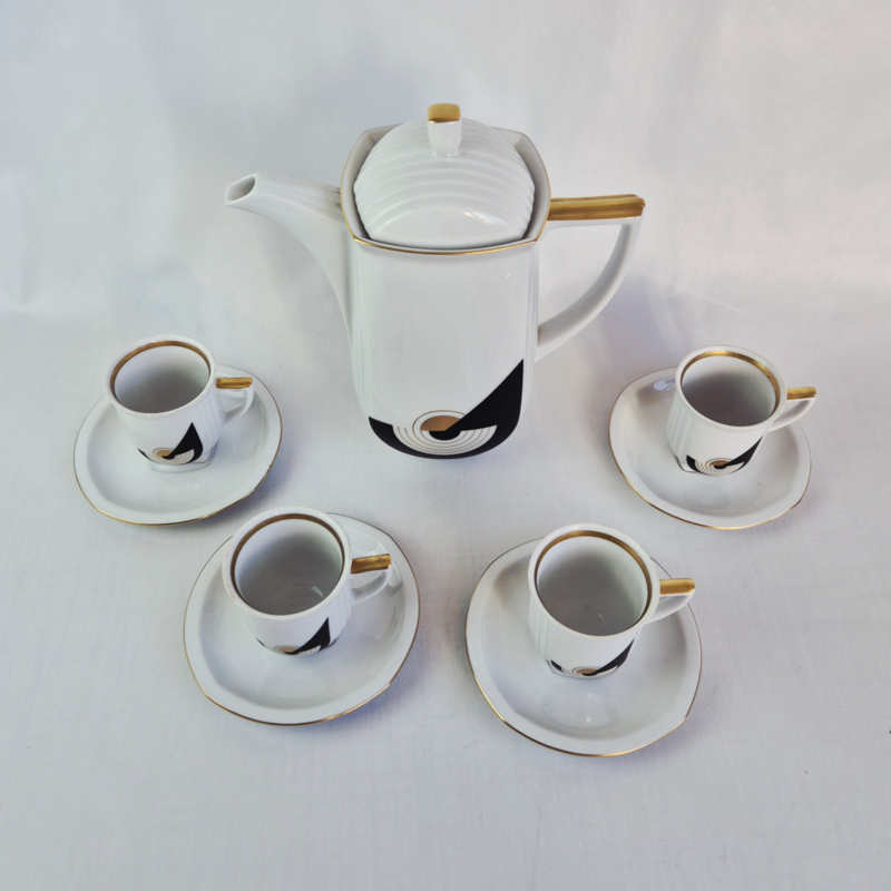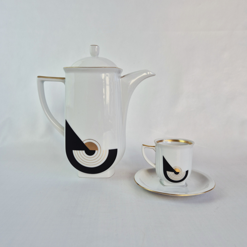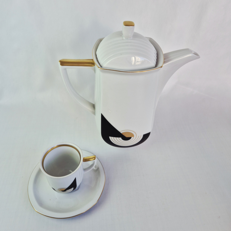 OverzichtElegant vintage koffieservies van Studio Carlsbad, model ‘Lisette’. Dit servies is een prachtig voorbeeld van Art Deco-invloeden: strak wit porselein gecombineerd met een grafisch zwart-goud decor en verfijnde goudranden. Een echte blikvanger voor liefhebbers van mid-century en Art Deco design.