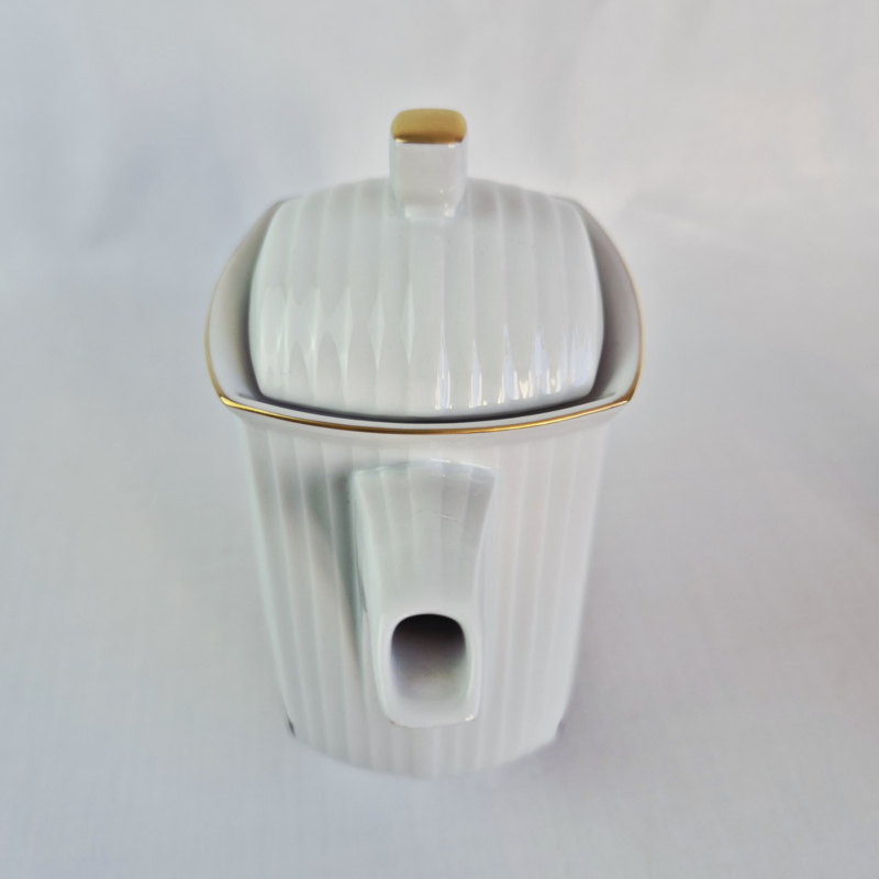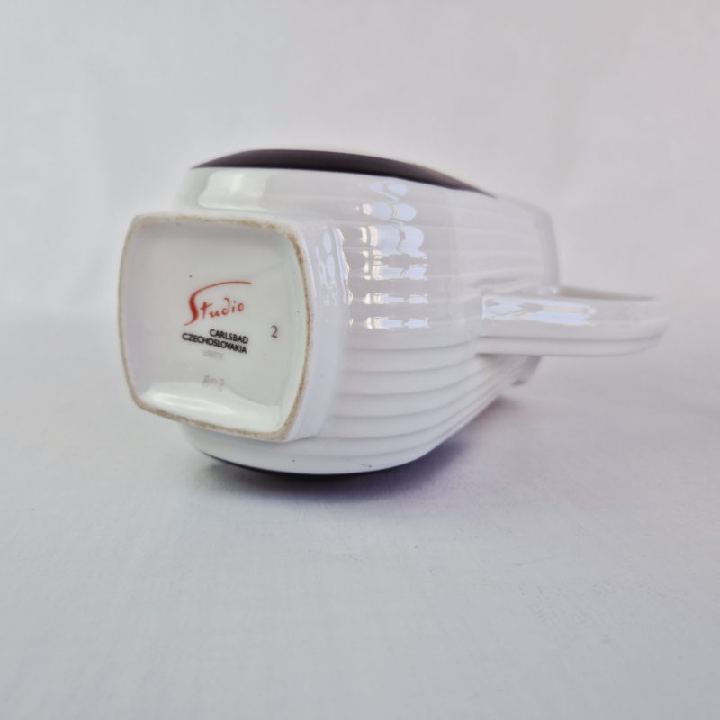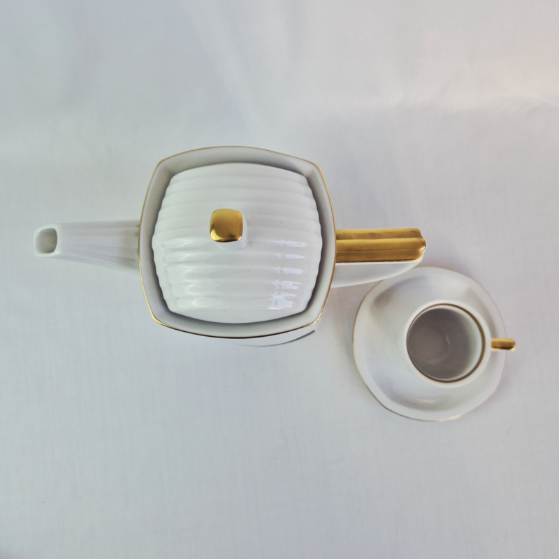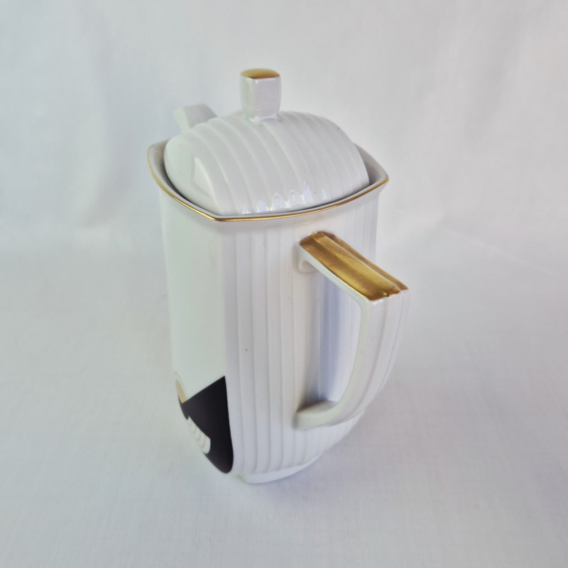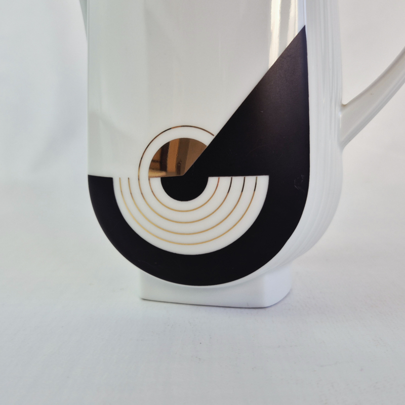 OverzichtElegant vintage koffieservies van Studio Carlsbad, model ‘Lisette’. Dit servies is een prachtig voorbeeld van Art Deco-invloeden: strak wit porselein gecombineerd met een grafisch zwart-goud decor en verfijnde goudranden. Een echte blikvanger voor liefhebbers van mid-century en Art Deco design.