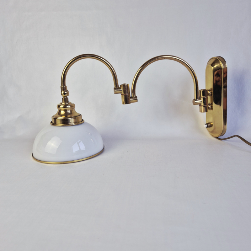 Vintage Kemner Wandlamp Messing & Wit GlasStijlvolle vintage wandlamp van Kemner met een elegante combinatie van messing en een witte glazen kap. De verstelbare arm geeft de lamp een functioneel én decoratief karakter – perfect als leeslamp of sfeerverlichting.
