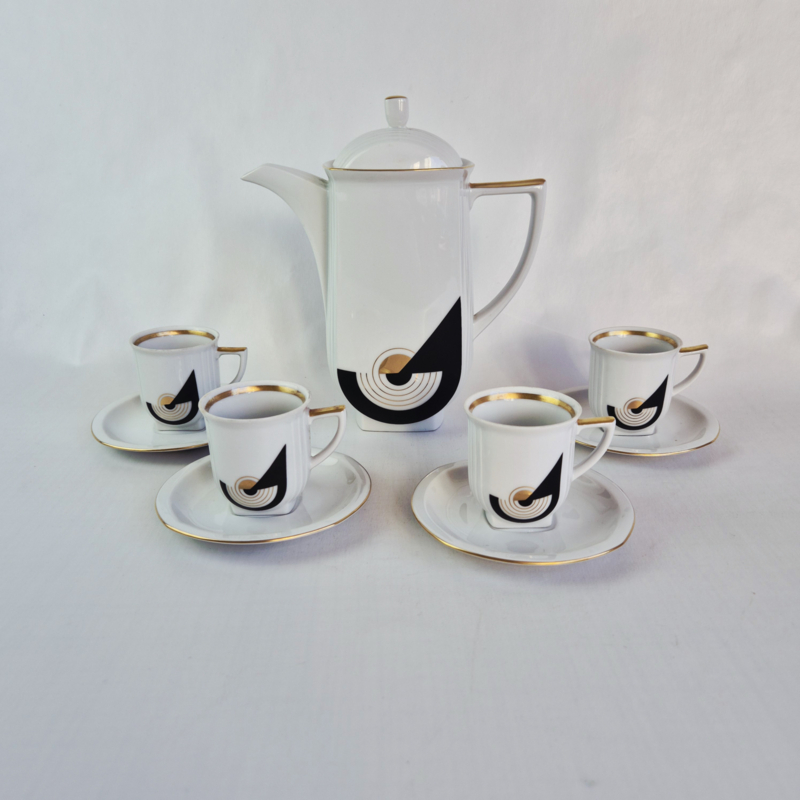 Studio Carlsbad Tsjecho-Slowakije koffieset | Boheme porselein 'Lisette'Elegant vintage koffieservies van Studio Carlsbad, model ‘Lisette’. Dit servies is een prachtig voorbeeld van Art Deco-invloeden: strak wit porselein gecombineerd met een grafisch zwart-goud decor en verfijnde goudranden. Een…