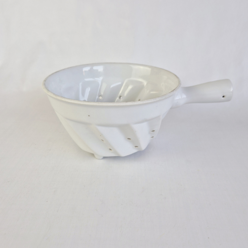 Franse Vintage Vergiet PorseleinPrachtige Franse vintage porseleinen vergiet is een wit, op pootjes staand model van faience, ideaal voor het wassen van bessen en ander klein fruit.