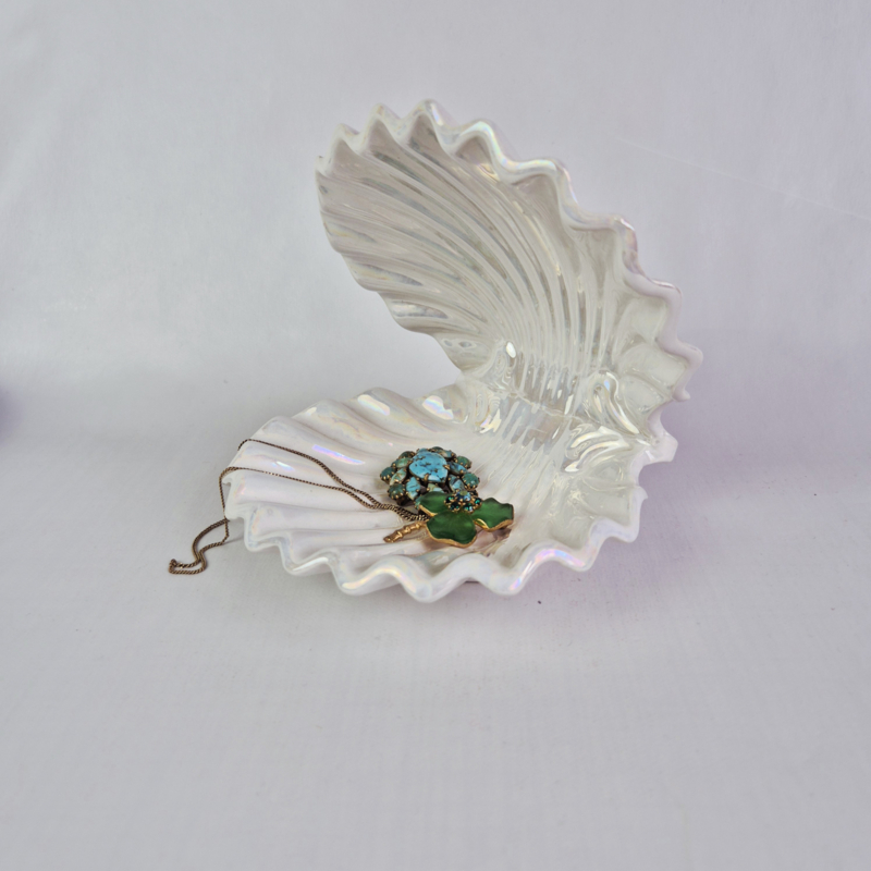 Schelp Schaaltje Porselein | Pereiras PortugalElegant vintage porseleinen schelp schaaltje van Pereiras Portugal. Het schaaltje heeft een mooie schelpvorm met een subtiele iriserende parelmoer glans, waardoor het licht prachtig weerkaatst.