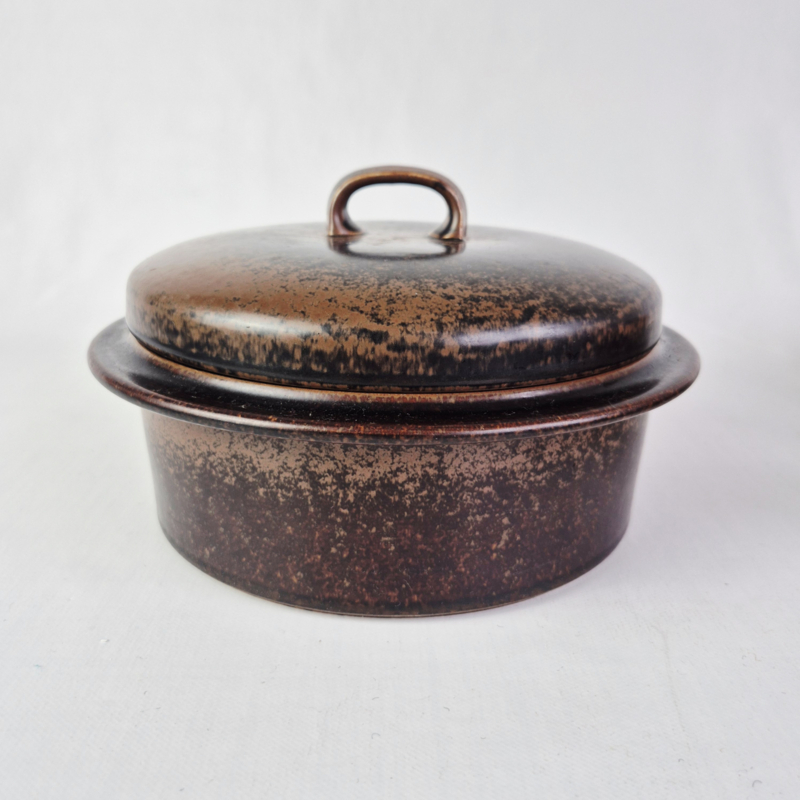 Arabia Ruska Finland Dekschaal LAuthentieke vintage servies van het iconische Arabia Ruska servies, ontworpen door Ulla Procopé. Het servies staat bekend om zijn robuuste, rustieke uitstraling en unieke, donkerbruine spikkelglazuur.